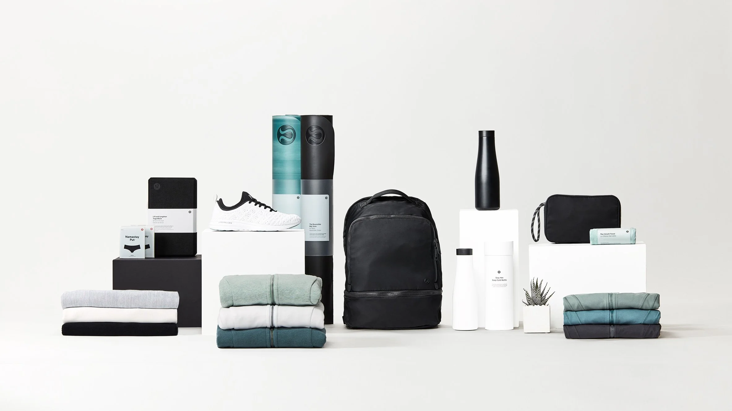 Box fresh representing the lululemon’s core franchises in a simple system of flat lay photography.